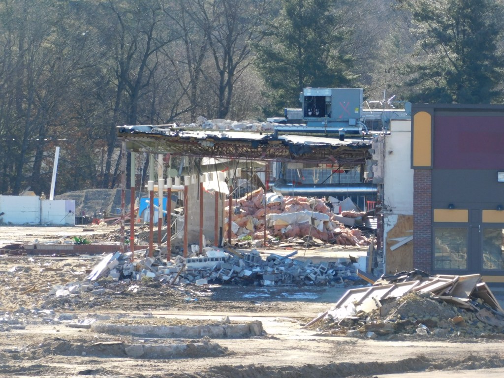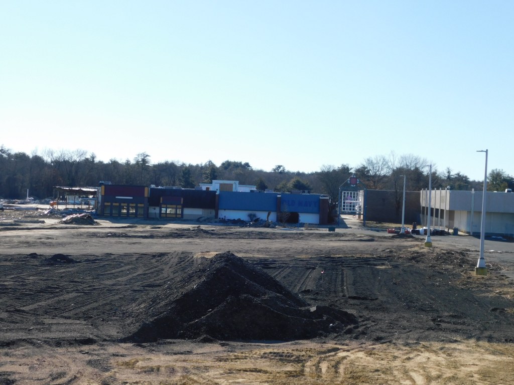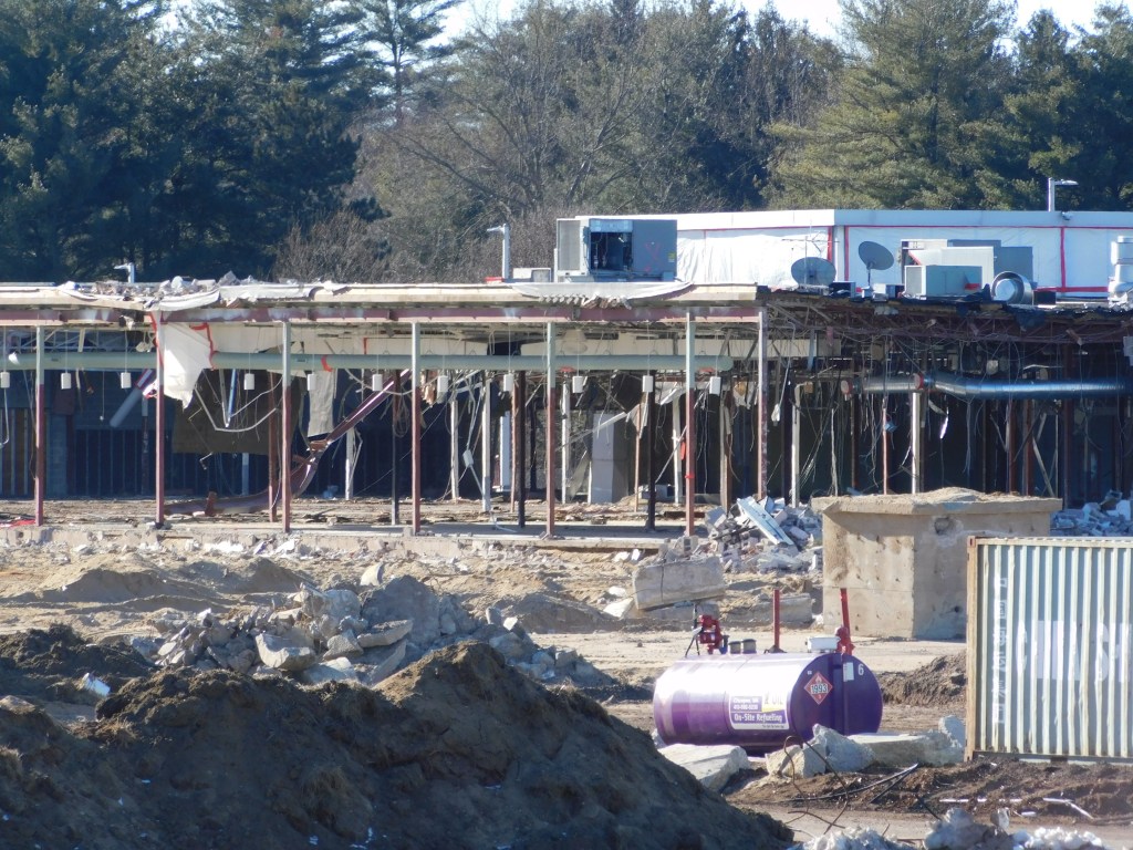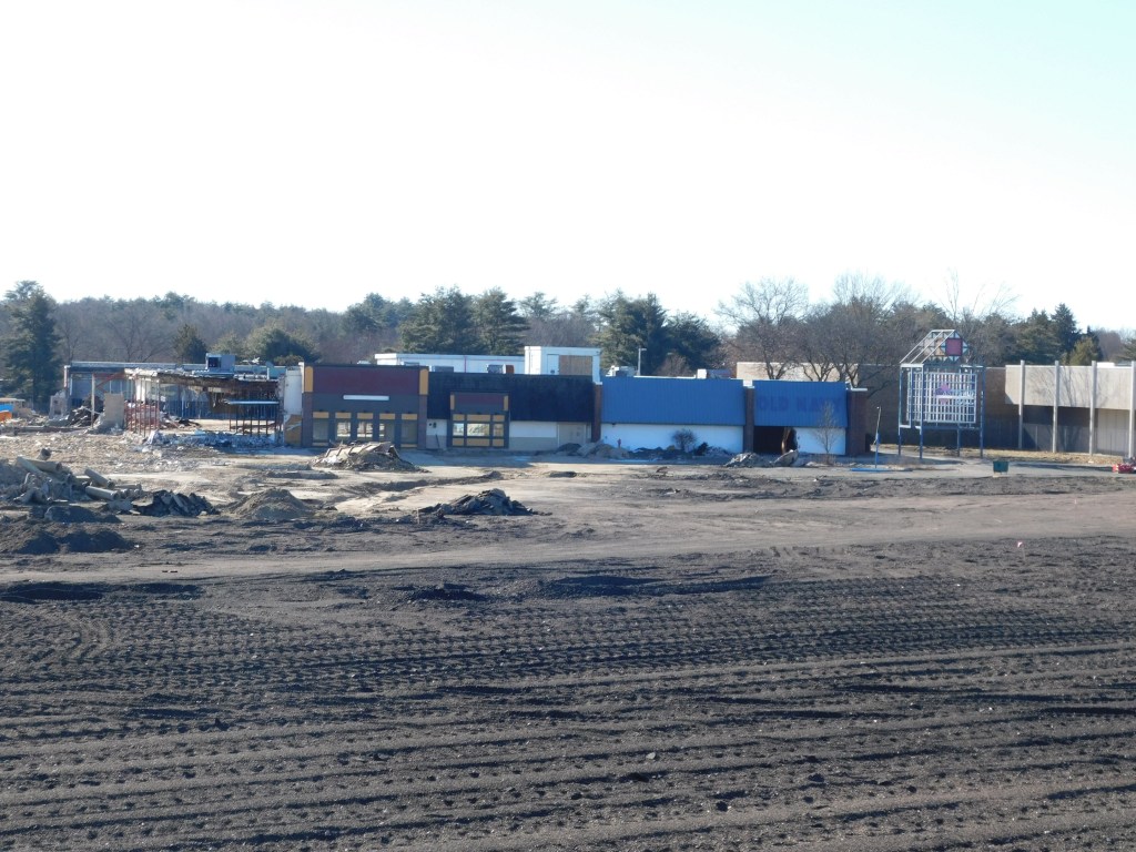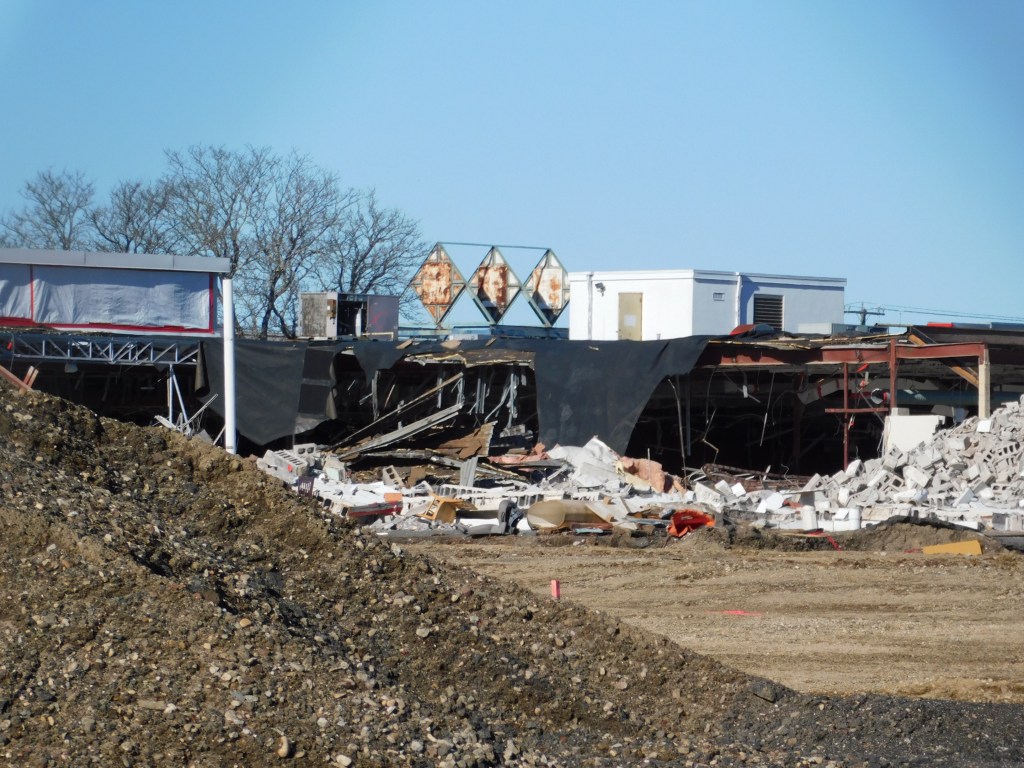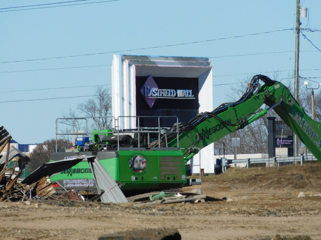 The picture above was taken this morning. This is all that is left of the once beautiful Eastfield Mall. We are left with the front wall of the 99 restaurant and the back wall of Old Navy. The Sears entrance still stands and with it the only remaining mall entrance sign. After months of demolition, it is almost gone. I can’t begin to wrap my head around it. How could decades of history be gone? The historic architecture of Forbes and Wallace has been lost forever. It was the last Forbes and Wallace building still standing after going out of business 50 years ago. Over the years, the other locations were demolished including the grand flagship store on Main Street in Springfield, Ma.