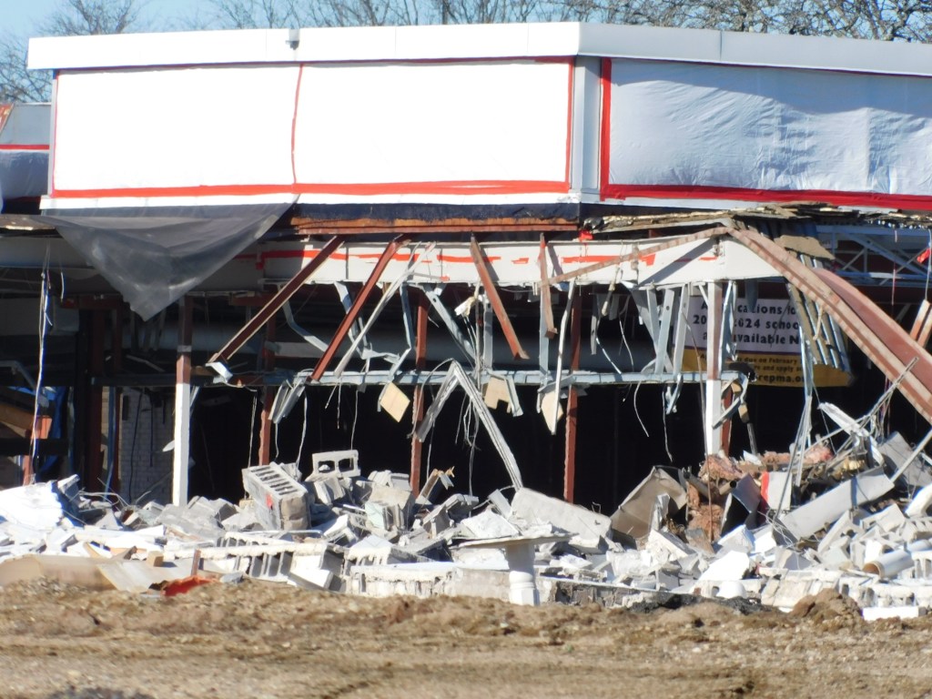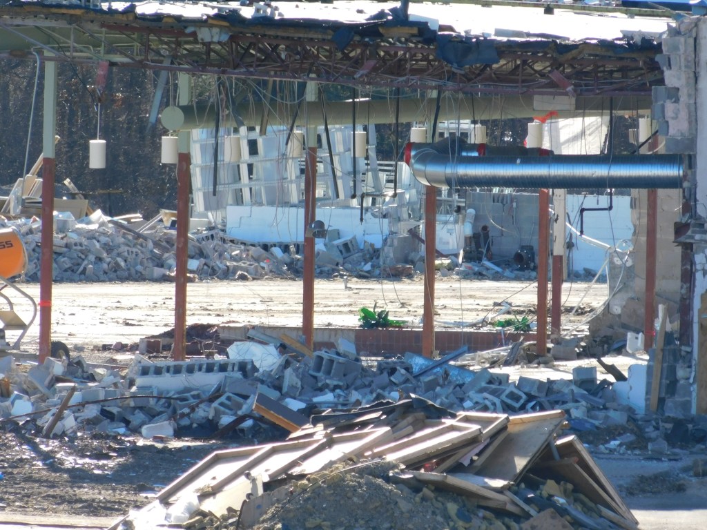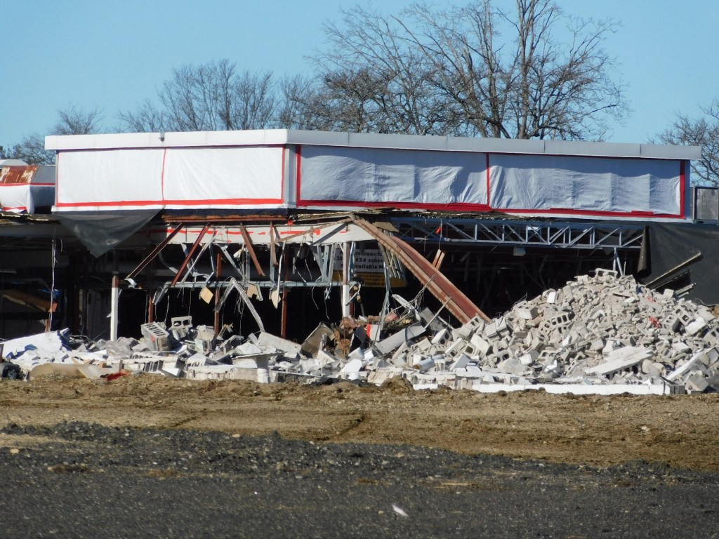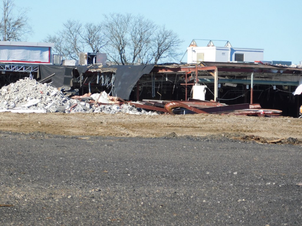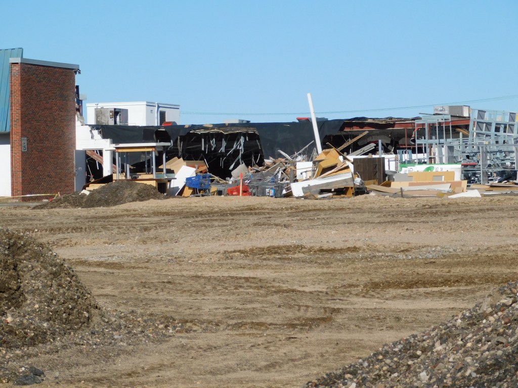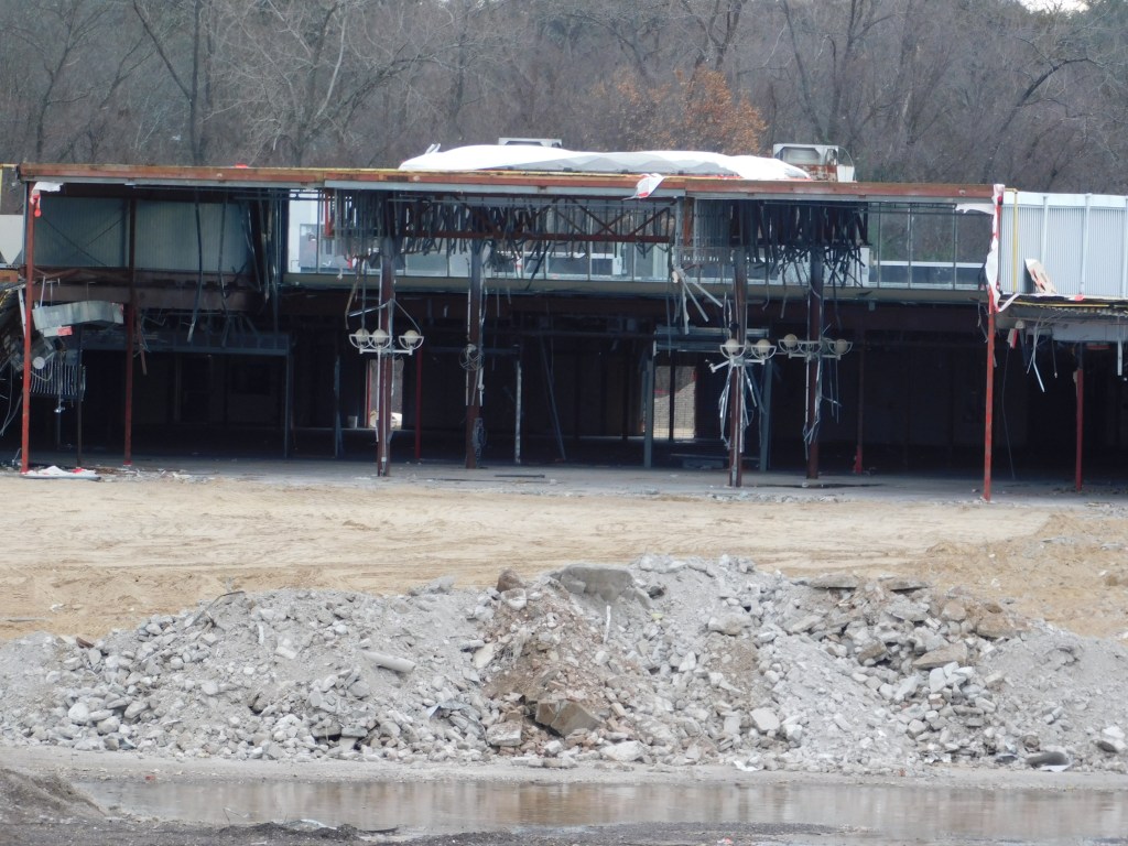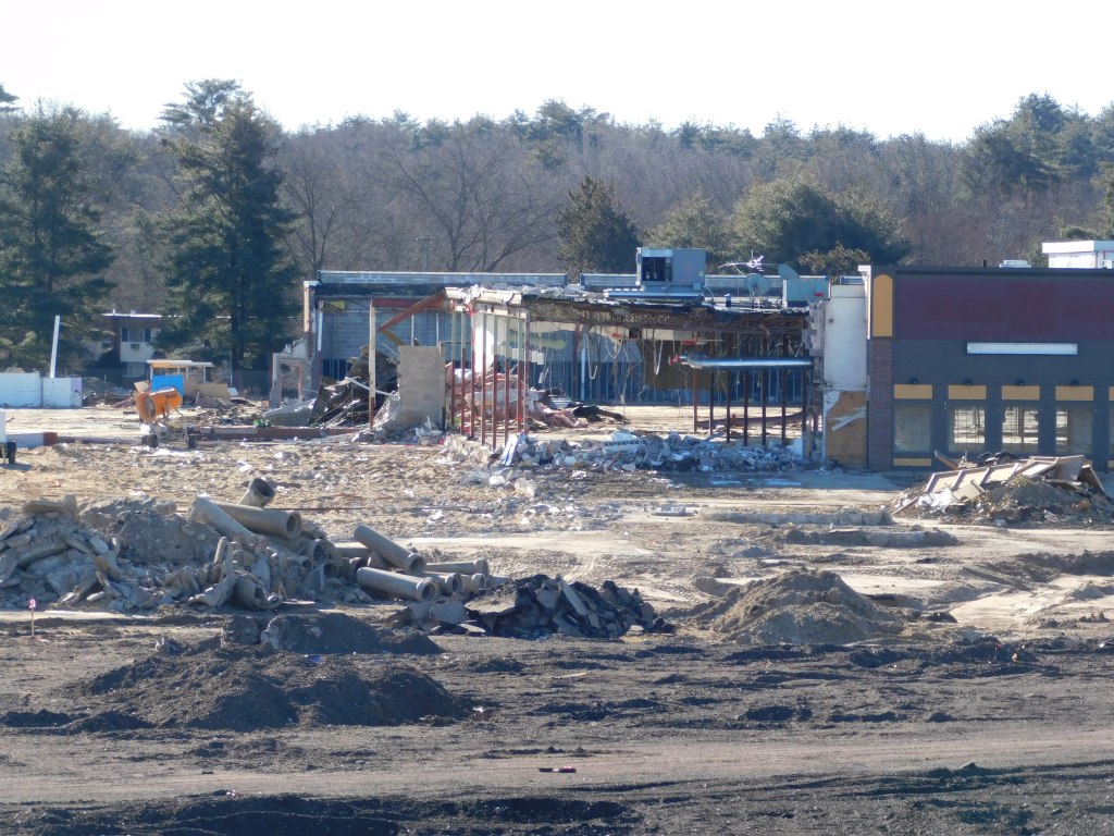 The picture above was taken this morning. This is all that is left of the once beautiful Eastfield Mall. We are left with the front wall of the 99 restaurant and the back wall of Old Navy. The Sears entrance still stands and with it the only remaining mall entrance sign. After months of demolition, it is almost gone. I can’t begin to wrap my head around it. How could decades of history be gone? The historic architecture of Forbes and Wallace has been lost forever. It was the last Forbes and Wallace building still standing after going out of business 50 years ago. Over the years, the other locations were demolished including the grand flagship store on Main Street in Springfield, Ma.
